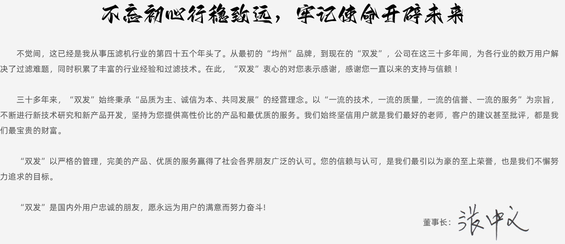 “濾污水為清泉,變污泥為凈土,還廢礦渣為青山綠地”,誠信塑品牌,質(zhì)量出名牌。三十多年來,“雙發(fā)”始終秉承“品質(zhì)為主、誠信為本、共同發(fā)展”的經(jīng)營理念。以“一流的技術(shù),一流的質(zhì)量,一流的信譽(yù)、一流的服務(wù)”為宗旨。不斷進(jìn)行新技術(shù)研究和新產(chǎn)品開發(fā),堅(jiān)持為用戶提供高性價比的產(chǎn)品和最優(yōu)質(zhì)的服務(wù)。